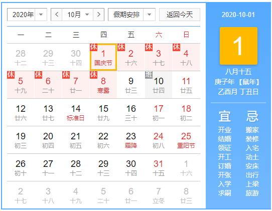 10月1日(星期四)-10月8日(星期四)放假,共8天。